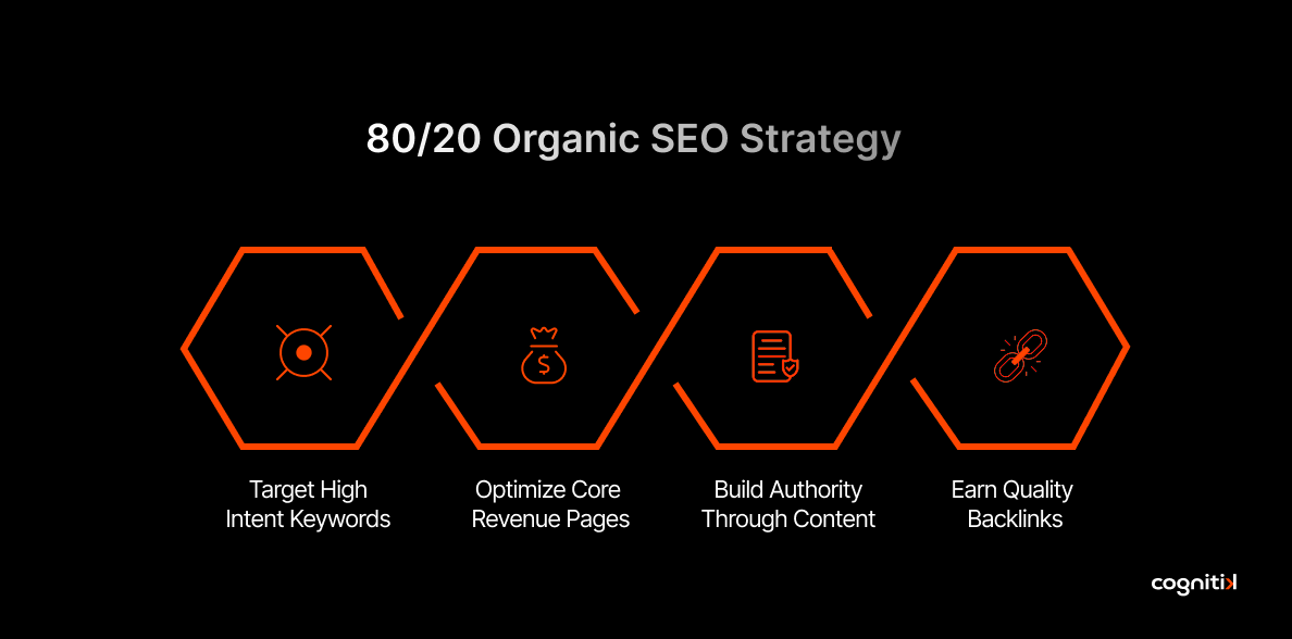 This happens because not every SEO activity contributes equally to revenue. The 80/20 Organic SEO Strategy is built on a practical principle: a focused portion of well-planned actions drives the majority of measurable outcomes, including rankings, traffic, and conversions.