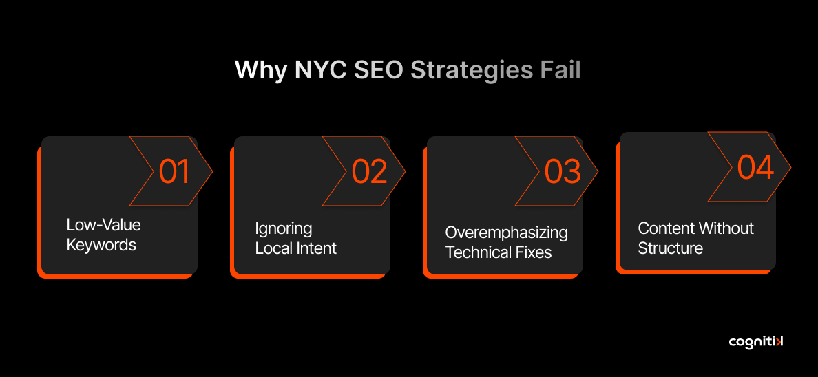 • Applying a generic framework without considering local SEO in New York can limit growth, as competition and search behavior vary across industries.